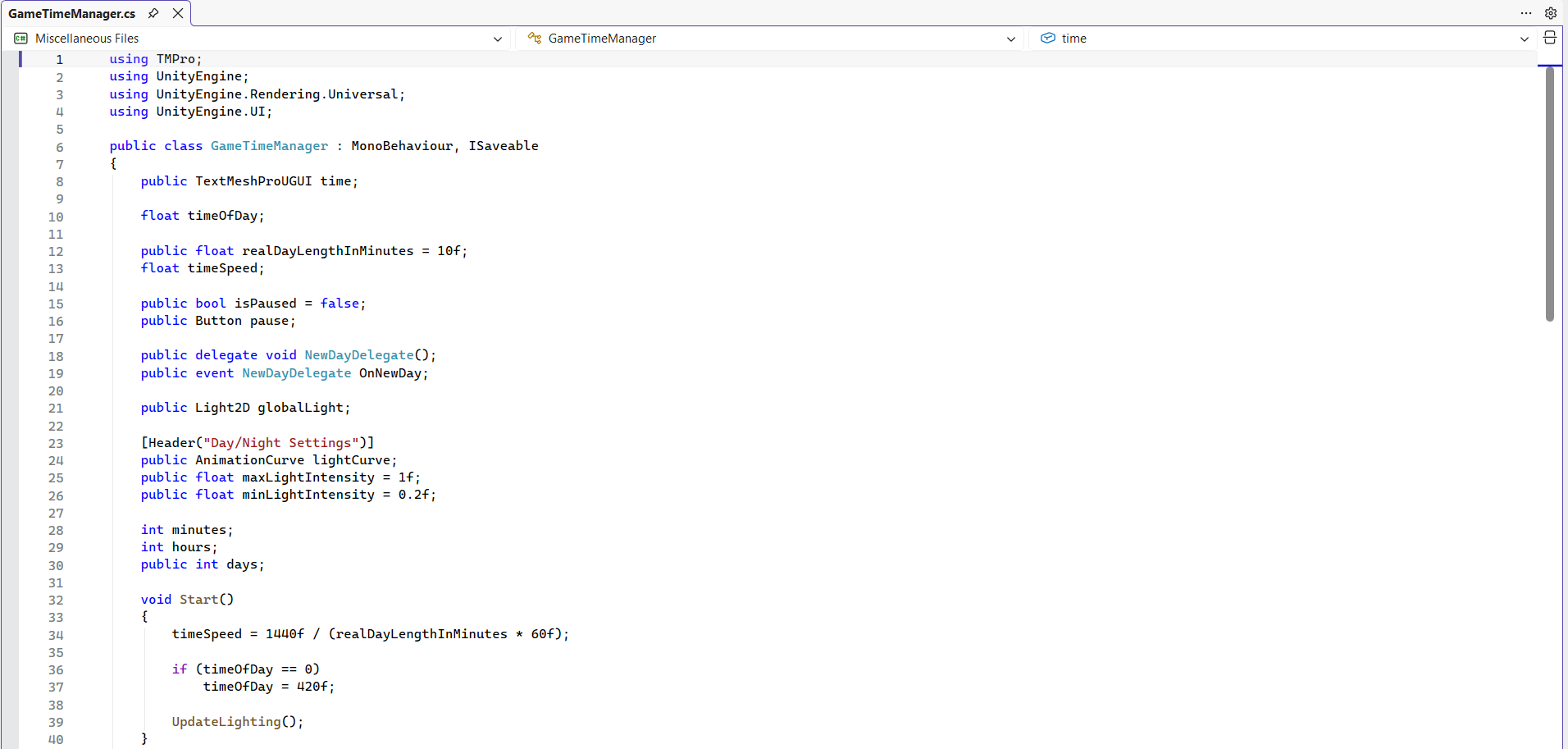 NewDayDelegateto trigger specific game logic (like crop growth or shop restocking) exactly when the day flips. - Save System Ready: Implements the
